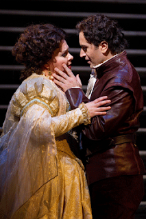 alt=""id="BLOGGER_PHOTO_ID_5713586627555492706" /> I have seen actual Met productions -- but always from a balcony seat. Even with good binoculars the experience is very different from seeing the video simulcasts. I feel very lucky indeed that they are shown here in a theatre not too far from me, at prices that are reasonable. This has becomes another kind of opera experience. Yesterday I saw Ernani from the met. I have seen in on video once and knew I loved the lushness of Verdi's solos and duets and trios and the big choral pieces. Although the story does not make much sense -- all those old guys in love with one pretty young thing and she steadfastly holding out for the bandit Ernani who, of course, is really a count. The cast was brilliant, Angela Meade, young but with a powerful voice was the young woman. Usually it's the tenor who steals one's heart but in this case I fell for the baritone, Dimitri Hvorostovsky, who had magnificent arias as Carlos V of Spain and looked like a fairy tale prince all grown up (a white wig -- these days white hair can be a turn on) and the most gorgeous costume on stage. His voice, for me, was more wonderful than tenor or bass or soprano. This was a new opera experience, I am still moved by it. And I look forward to early April when they will simulcast my beloved La Traviata and I will go well armed with Kleenex or maybe even a couple of study cotton handkerchiefs.